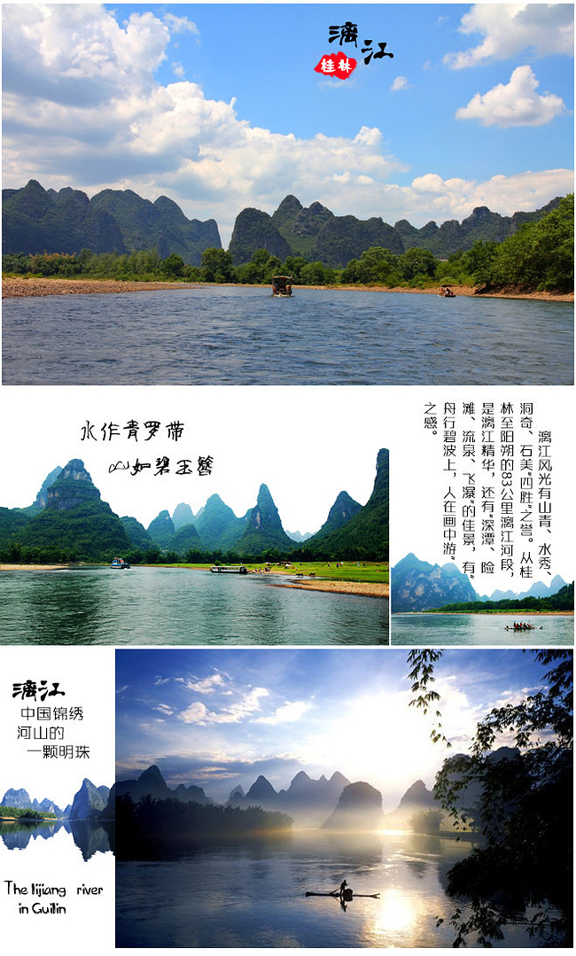 行程建议1--6人乘坐:D1,桂林出发,龙脊梯田一天,晚上住桂林。D2,桂林出发,漓江精华段(杨堤--兴坪)竹筏游漓江、蝴蝶泉景区,大榕树、月亮山、印象刘三姐、住阳朔。D3,遇龙河、世外桃源、象鼻山、晚上住桂林,结束行程。