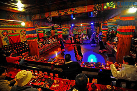 品尝民族特色晚餐-前往扎雅土司园欣赏藏民族歌舞用特色土司家宴(藏区顶级藏民家访—扎雅土司园通过歌舞向您展示这片神奇美丽的人间乐土,人与自然和谐的家园,并在欣赏歌舞同时以分餐形式品尝当地美食及牦牛火锅)。之后入住酒店(四星藏式商务酒店)