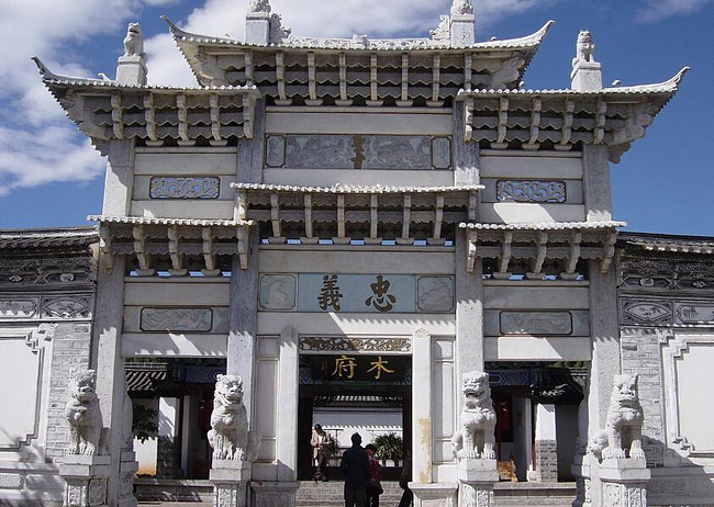“北有故宫,南有木府”。跨过清泉汩汩的流水小桥,突见一座木牌坊赫然立于土木瓦顶居民之间。跨进朱红色的木府大门,眼前豁然开朗,一片开阔的地面上巍然耸立一座金碧辉煌的宫殿,汉白玉基座雕刻精美,那恢宏的气势,使人恍若置身于皇宫之内。